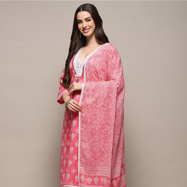 Pink printed kurta fabric, lace detail